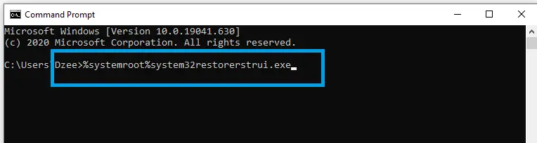 - Setelah masuk ke Window CMD, ketikan perintah “%systemroot%system32restorerstrui.exe“.